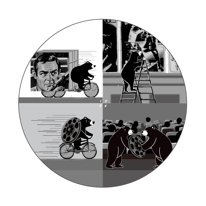 一部電影好多卷膠卷,戲院每播完一卷,他就「咻~」地騎著腳踏車,