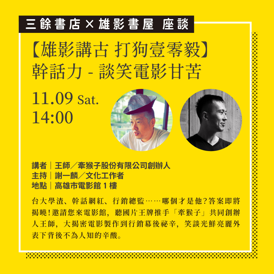 邀請您來電影館,聽國片王牌推手「牽猴子」共同創辦人王師,大揭密電影製作到行銷幕後祕辛,笑談光鮮亮麗外表下背後不為人知的辛酸。