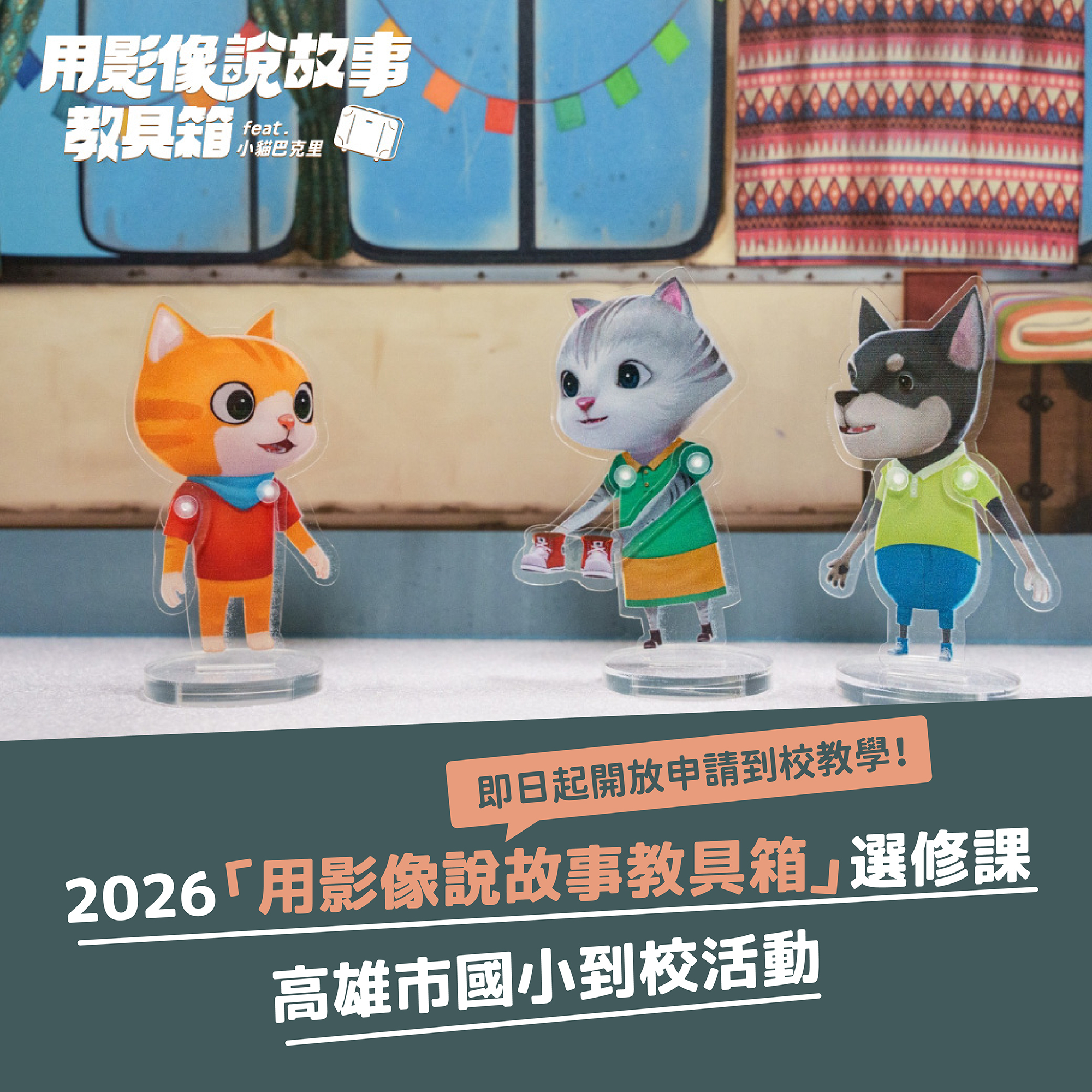 高市電影館更宣布2026年持續續辦理「用影像說故事教具箱」選修課,電影館將帶著授課講師及教具箱內的小貓巴克里全套教具進入合作學校,提供有興趣的大高雄地區國小以班級為單位進行申請,即日起歡迎校方申請。2026年將於2月展開入校課程。