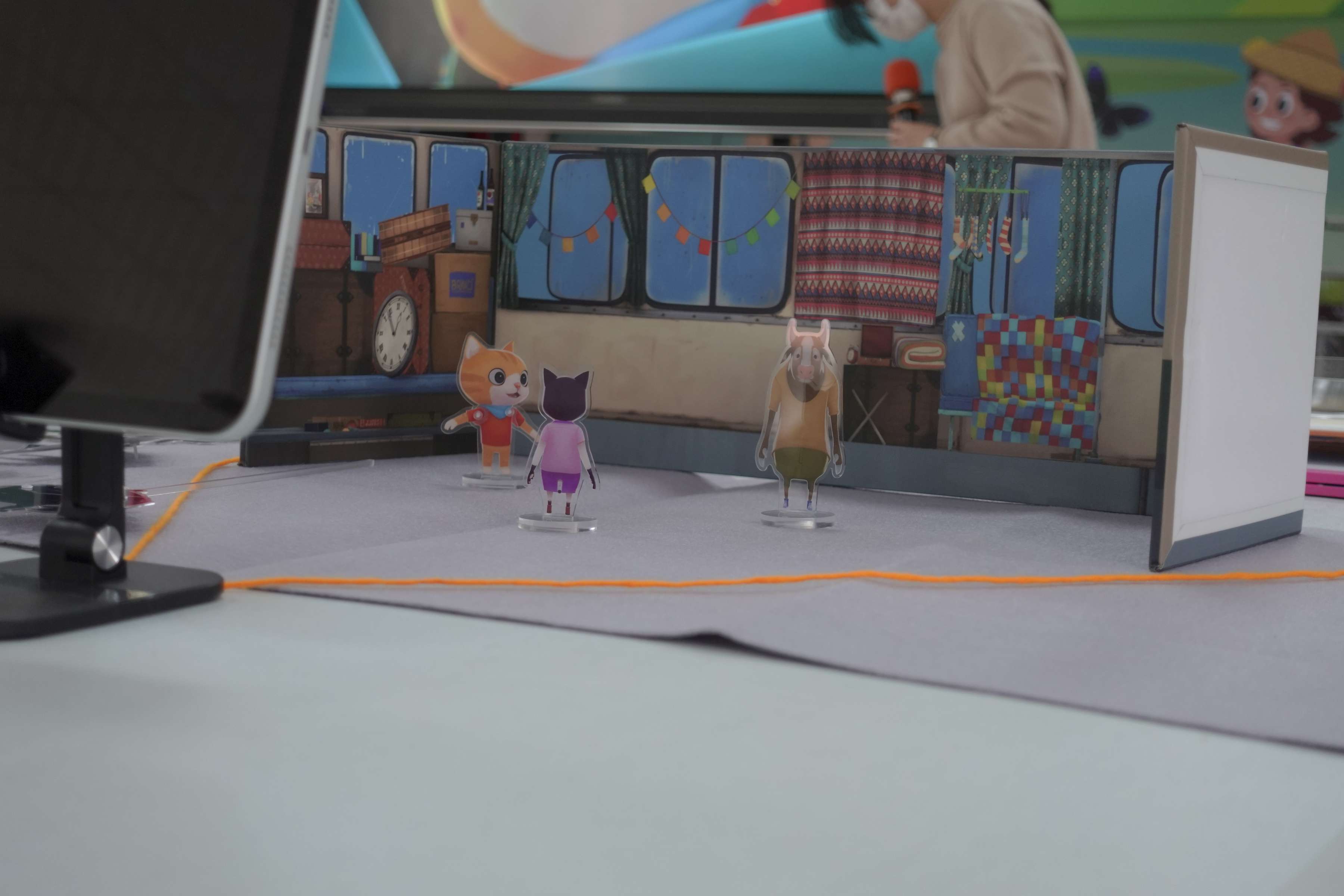 「用影像說故事教具箱feat.小貓巴克里」的教具本身,精彩重現《小貓巴克里》動畫中精美佈景畫面、角色人偶以壓克力特製,每一組備有三種不同前景背板,還有可更換白天或晚上的背景布幕,角色人偶更有左右不同方向的特殊設計;教具箱不只是完美復刻這些成功的畫面元素,同時更提供專業的平板腳架與畫面穿幫線,協助學生理解鏡頭大小與畫面構成的關係,更貼心提供如操控棒與膠條,讓角色人偶可隨心所欲移動,一邊操偶並一邊拍攝,完全不卡關,教學現場只要預備一張桌子和一台拍攝用平板就可以開心上課!